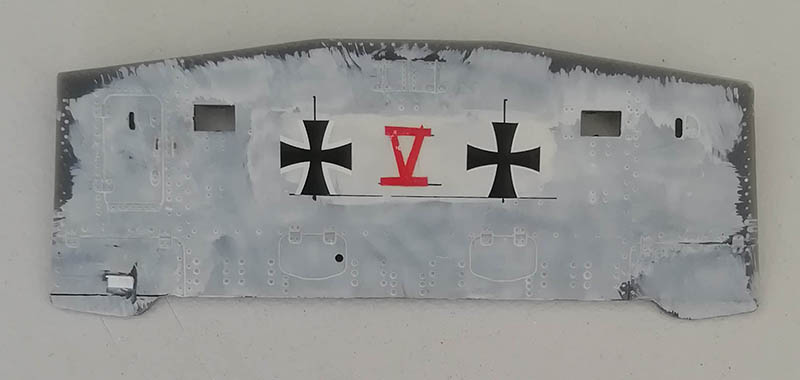 El número "V" los hice también usando varios sets de Italeri, pero de una forma bastante trabajosa, pues corté tiras de un grosor y longitudes adecuados y las pegué hasta "construir" de esta forma el número romano "V". Y después hay que perfilar el número en blanco.