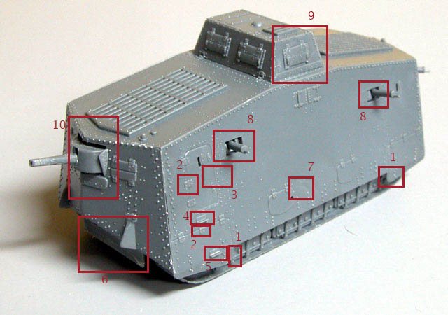 Como se dijo más arriba, no hubo dos A7V exactamente iguales. Además, y esto es muy importante, el kit de Emhar no representa a ningún A7V en concreto, así que, queramos el vehículo que queramos, tendremos que hacer modificaciones, sí o sí. Montar simplemente el kit como sale de la caja (ver foto de la derecha) nos dará un vehículo de fantasía, históricamente incorrecto.